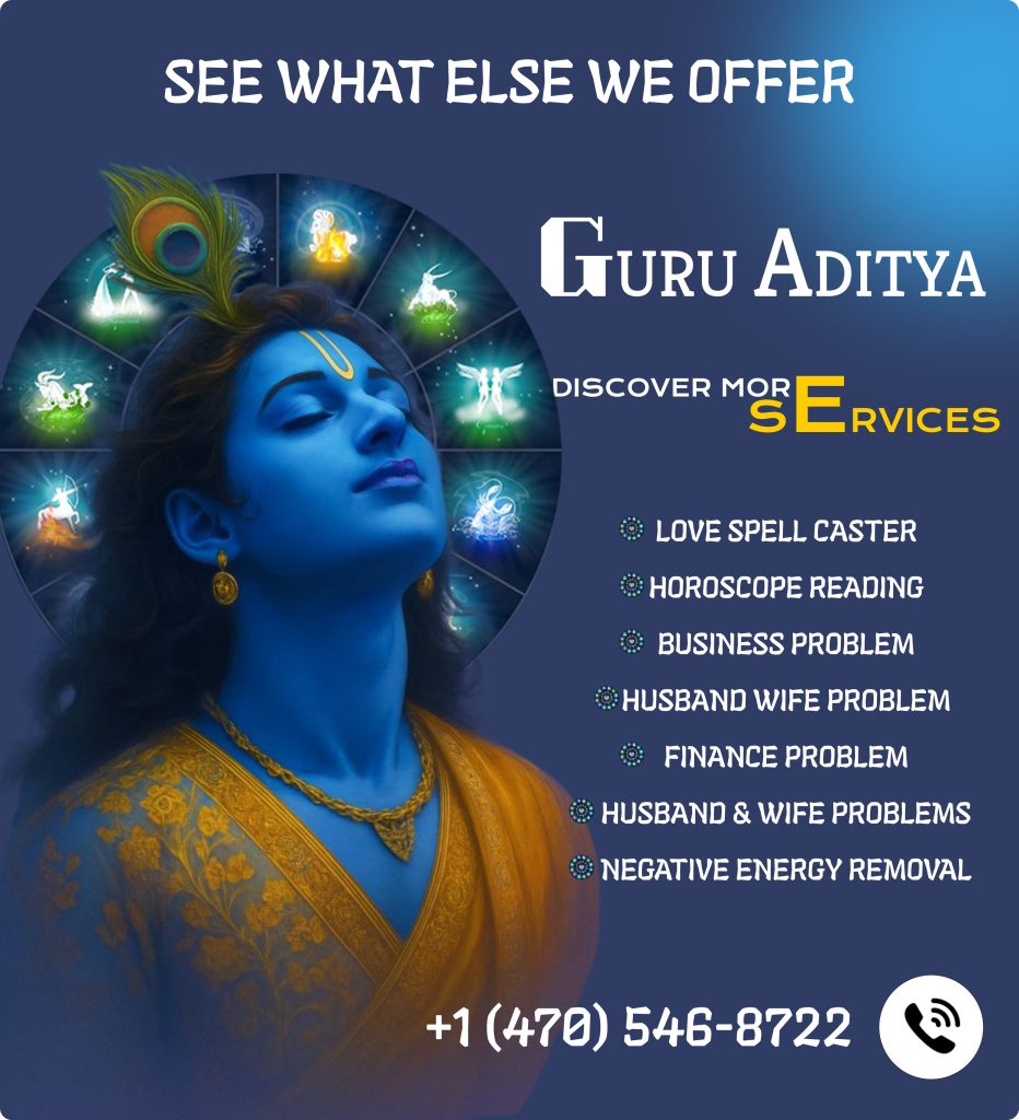 Guru Aditya offers a wide range of astrology and spiritual solutions, including Horoscope Reading, Palmistry, Love Compatibility, Black Magic Removal, Business & Finance Guidance, Love Spell Casting, Relationship Healing, and solutions for Family, Marriage, and Career-related issues. Every consultation is personalized to help you overcome challenges and find the right path toward peace, prosperity, and happiness.